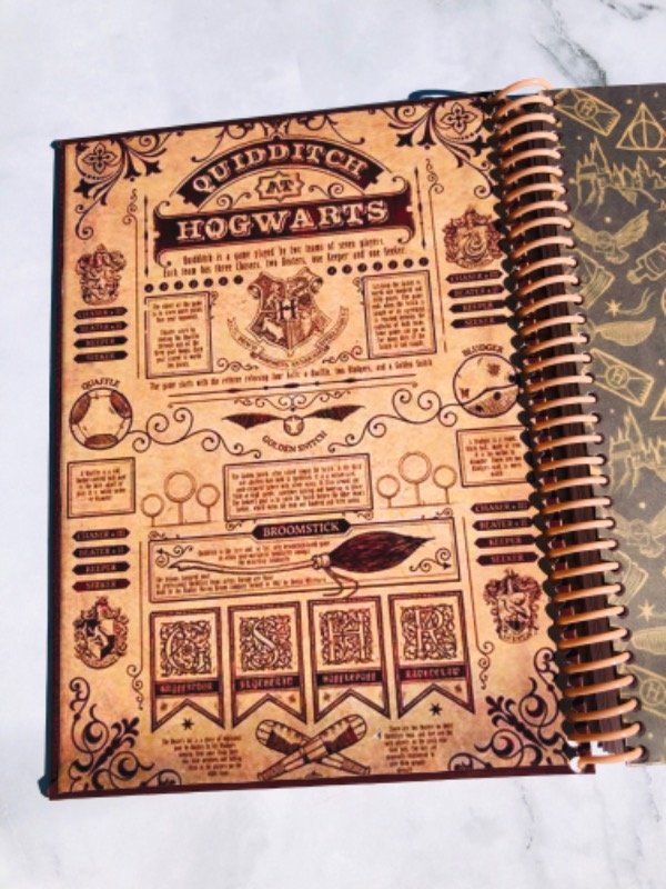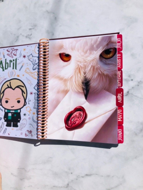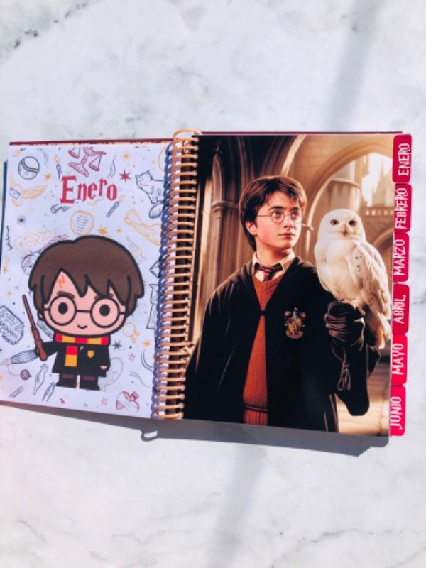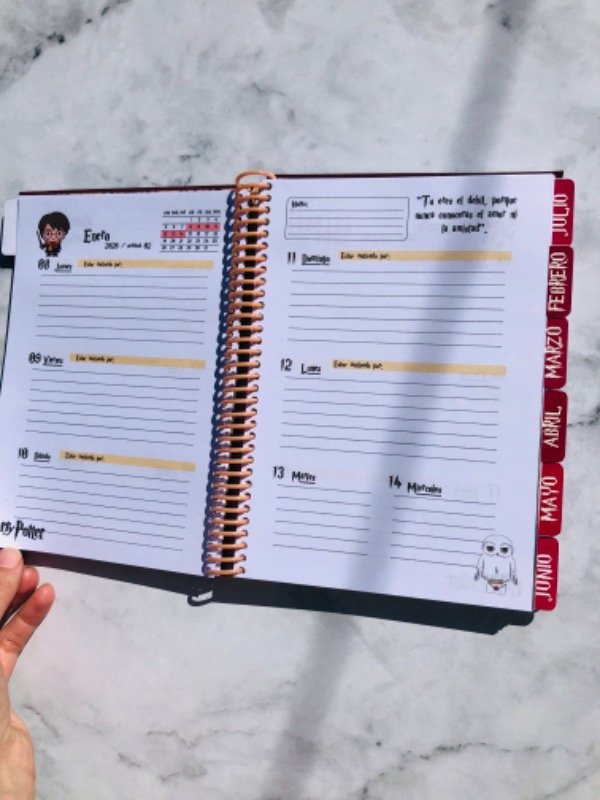 Llena de dibujos, fotos y frases de los personajes en toda la agenda.